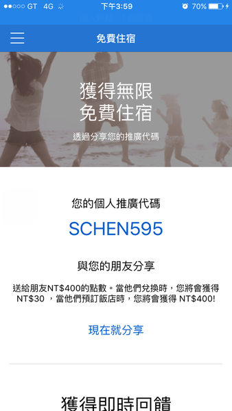 當他人使用自己代碼即得30點回饋,使用此組代碼訂房成功會再回饋房價10%點數(改版後更新)