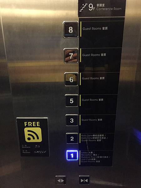 從電梯就可以看到飯店共有九層,還有各樓層簡介,這次的房間是安排在八樓