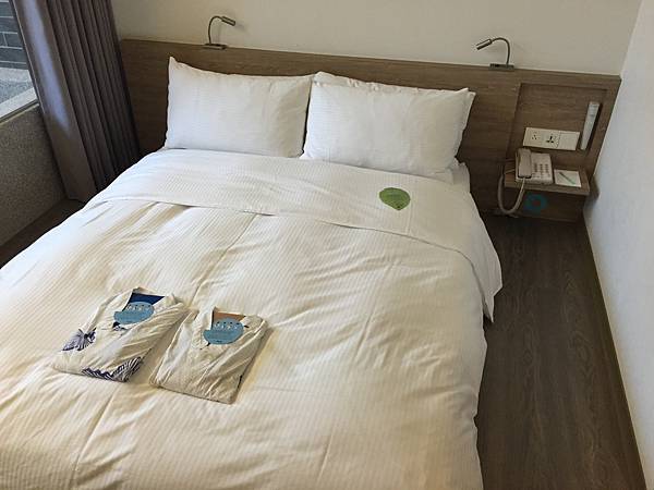 床上準備了兩件浴衣,床頭兩側還有貼心的小閱讀燈,電話旁有手電筒