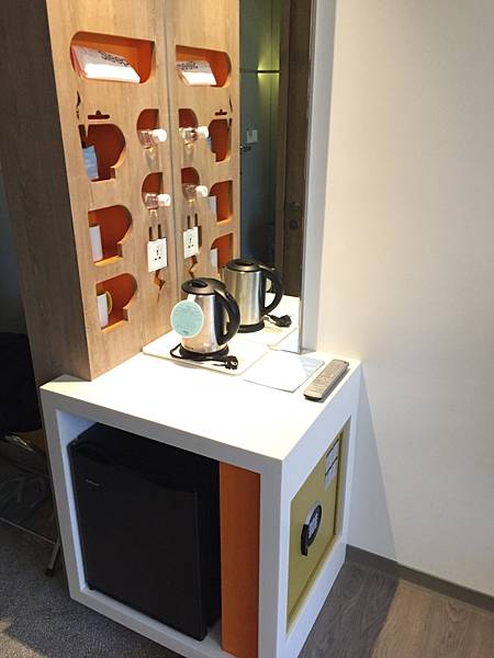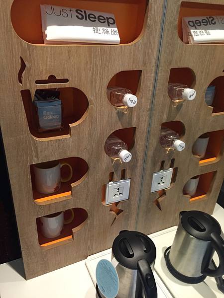 桌上熱水壺、茶包、咖啡包、馬克杯、兩瓶礦泉水...
